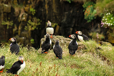 アイスランドを象徴する小さな海鳥。渡り鳥なのでアイスランド以外にも分布してはいるのですが、世界分布の約60%がアイスランドで繁殖するとされます。和名はニシツノメドリ(西角目鳥)。ユーモラスな可愛らしさから人気のある鳥です。しかしこの鮮やかな姿で過ごすのは、実は繁殖シーズンである夏季のうちだけ。秋冬になるとぐっと地味な姿になり、まるで別の種類の鳥のようです。